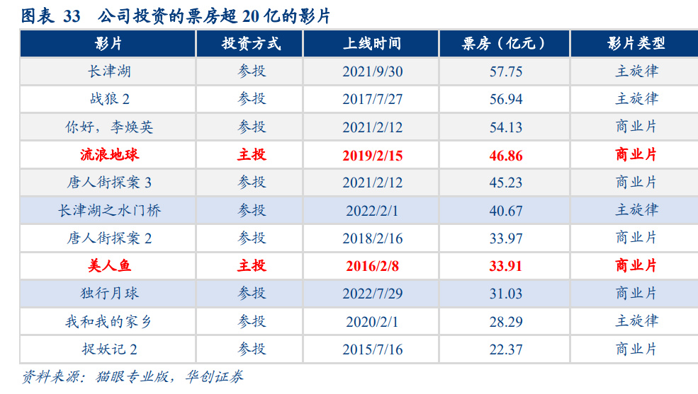 公司为中影集团旗下核心资产,是少数具备全产业能力的行业龙头。公司具备领先的内 容投资能力。复盘公司过往内容投资履历,公司多以参投方式参与投资,商业片与主旋 律偏皆有涉足与建树,历年投资影片票房超 20 亿的已达 11 部,其中参投 9 部,主投 2 部(《流浪地球》46.86 亿元+《美人鱼》33.91 亿元)。
