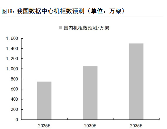 算力主要为未来数据经济相关的应用提供计算、存储等基础功能,主要通过多维度分布的数据中心提供算力支持。按照国家统一规划,未来我国有望形成多层次的算力体系架构,形成“中心算力(东数西算节点)”、“基础算力(各地数据中心机房)、“边缘算力(边缘数据中心)”等多维度计算体系。数据中心是算力重要载体,2025 年我国数据中心机柜需求量有望超过750万架。根据 CDCC 统计,截至 2021 年,我国存量数据中心机柜数超过350 万架,其中华东地区超过 100 万架,华南华北地区分别达到 90/80 万架,未来随着数字经济发展以及流量的增长,国内数据中心 2025 年规模有望超过750 万架。