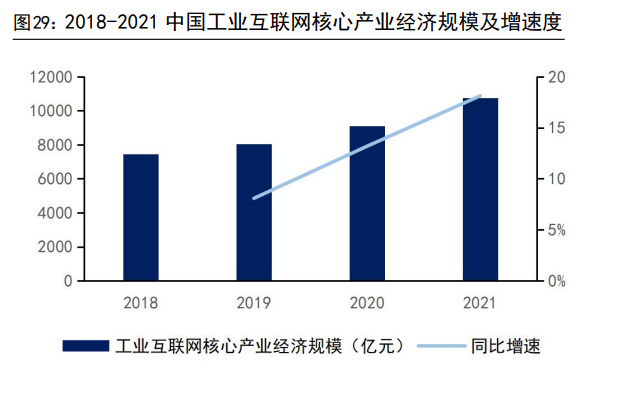 5G+工业互联网是 5G 行业应用主要发展方向。第五届“绽放杯”5G 应用征集大赛项目中,5G 应用在工业制造、电力、港口、矿山等行业已初步向核心环节渗透,应用深度不断提升。2022 年 8 月工信部发布《5G 全连接工厂建设指南》,该指南指出提出“十四五”时期,主要面向原材料、装备、消费品、电子等制造业各行业以及采矿、港口、电力等重点行业领域,推动万家企业开展5G 全连接工厂建设,建成 1000 个分类分级、特色鲜明工厂,打造 100 个标杆工厂,推动5G 融合应用纵深发展。 我国工业互联网核心产业经济规模,2021 年已超万亿元并保持快速增长。根据中国互联网发展报告(2022)》显示,2021 年,我国数字技术产业体系不断完善,“5G+工业互联网”在建项目超过 1800 个,覆盖钢铁、电力等20 多个国民经济重点行业。具有一定行业、区域影响力的工业互联网平台超过100 个,连接设备数量超过 7600 万台套。工业互联网产业规模持续快速增长,2021 年我国工业互联网核心产业规模达到 10749 亿元,同比增速 18.1%。