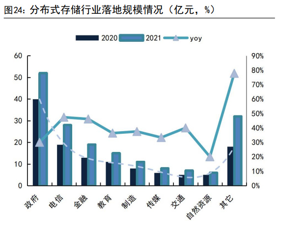我国分布式存储总规模快速增长,软硬一体机为主要形式。根据信通院数据,2021年中国分布式存储存储市场规模达到 178 亿元(同比+44%),其中分布式软硬件一体机总规模约 178 亿元,占比超过 90%,未来发展上软硬件一体机有望继续成为主要的形式。 分布式存储在电信金融等行业加速推广落地。从垂直行业落地的情况来看,2021年,分布式存储排名前五的行业分别是政府、电信、金融、教育以及制造业,从增速上拉看,2021 年增长前五的行业分别是电信、金融、交通业,分布式存储在行业应用推广持续加速。