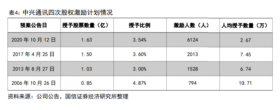 公司健全激励制度,完善治理架构。2020 年 10 月12 日,公司发布公告启动第四次股权激励计划。此次股权激励计划拟授予总量不超过16349.2 万份的A股股票期权,占公司总股本的 3.54%;本次授予的激励对象总人数共6124 人,约占公司目前在册员工总数的 8.84%,其中 99.15%将分配给包括研发、销售等核心骨干员工;行权价格为每股人民币 34.47 元。本次激励计划有效期为4 年,经过1年的等待期后每年分别有 1/3 股票期权在满足行权条件后可以行权。长期的股权激励计划既有助于维护公司核心团队稳定性,使公司管理队伍更重视公司中长期发展,同时也是公司对未来业绩确定性增长的信心的体现。