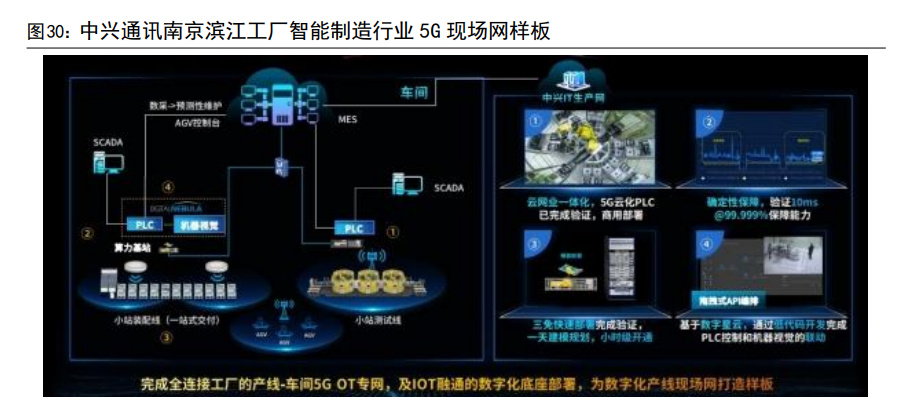 以中兴通讯 5G 基站设备南京滨江制造基地为例,公司部署在车间内的5G专网在提供 5G 覆盖的同时,成功上线 24 大类、110 余项5G+工业融合创新应用,包括AGV/数采/机器视觉/云化 PLC 等业务。其 PLC 及工控机MAT/MDS 业务联网&云化,实现了 PLC 集中云化部署及维护,降低了 50%的工控机成本。