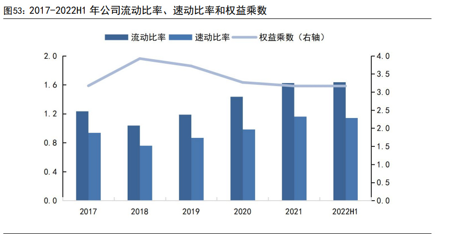 2022 年上半年公司流动比率、速动比率分别为 1.63、1.14,较2021 年基本保持稳定。2018 年-2021 年公司流动比率和速动比例呈现上升趋势,表示公司的流动风险持续改善。