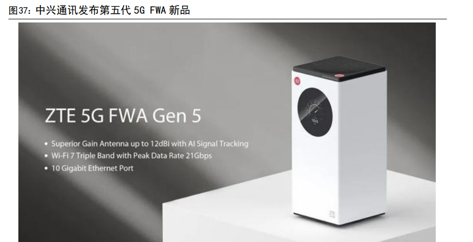 最新推出第五代 5G FWA 新品,行业竞争趋缓,公司有望进一步占据市场份额。2023 年的 MWC 2023(世界移动通信大会)上,中兴通讯发布会了5G FWA旗舰产品 ZTE 5G FWA Gen 5,支持 3GPP R17 最新标准,支持Wi-Fi 7 三频6GHz5GHz/2.4GHz 高中低速网络设备分层接入,Wi-Fi 峰值速率最高可达21Gbps,拥有万兆网口,带宽更高。随着行业竞争趋缓,公司抓住机遇有望扩大份额维持地位。