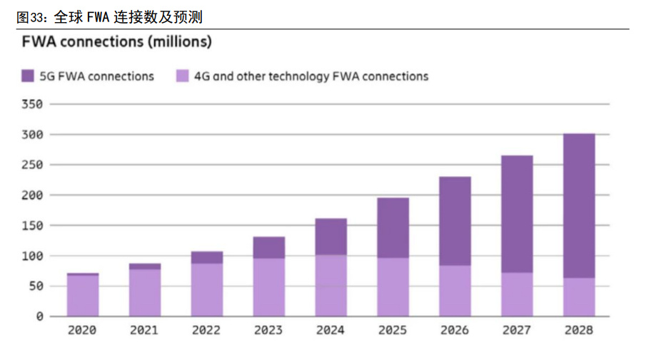 FWA 已得到运营商大力支持,2022-2028 年连接数保持快速增长。根据爱立信2022年 11 月《移动市场报告》的数据显示,在其调研的全球310 家运营商中,有238家提供 FWA 服务,占比达到 77%。截至 2021 年底,全球FWA 连接数超过1亿。在2022-2028 年期间,FWA 预计将以每年 19%的速度增长。到2028 年底,连接数将达到 3 亿,而 5G FWA 连接数预计到 2028 年将会达到2.35 亿左右,占总连接数的 80%。