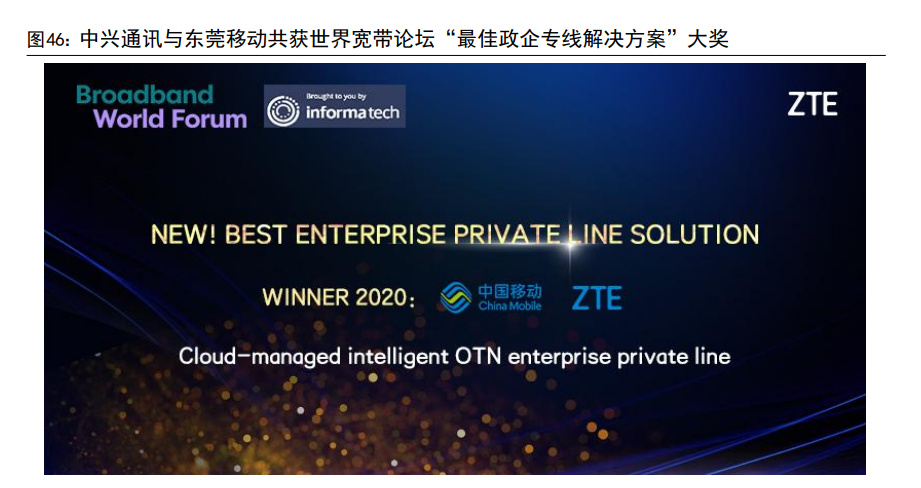 公司在运营商网络侧解决方案积累深厚,并将相关方案逐步赋能各行各业。公司为运营商超百万基站及大规模传输光网络提供可靠智能运营商解决方案积累深厚,电信网络设备从传统设备演进到虚拟化、云化的解决方案规模达,难度高,公司沉淀的技术方案也在为政府、交通、电网、金融、矿山等领域提供: 数字政府的网络技术创新云解决方案已在国家部委、省市政府及金融、能源等行业成功实践。 智慧交通的城轨云解决方案,为多地城市地铁视频线网提供计算、存储、网络等服务,按照“集约高效、共享开放、安全可靠、按需服务”的原则,助力城轨智能化、智慧化发展。 公司为多个大型煤矿提供 5G+智能矿山专网解决方案,全国首次5G700MHz频段在煤炭领域试点成功。 推出了业界首个 5G ATG 地空互联方案,并在世界5G 大会上荣获5G 应用设计揭榜赛大奖 政企信息化获得行业高度认可。中兴通讯与东莞移动联合打造的政企智能光网络案例荣获 2020 年世界宽带论坛“最佳政企专线解决方案”(Best EnterprisePrivate LineSolution)大奖。