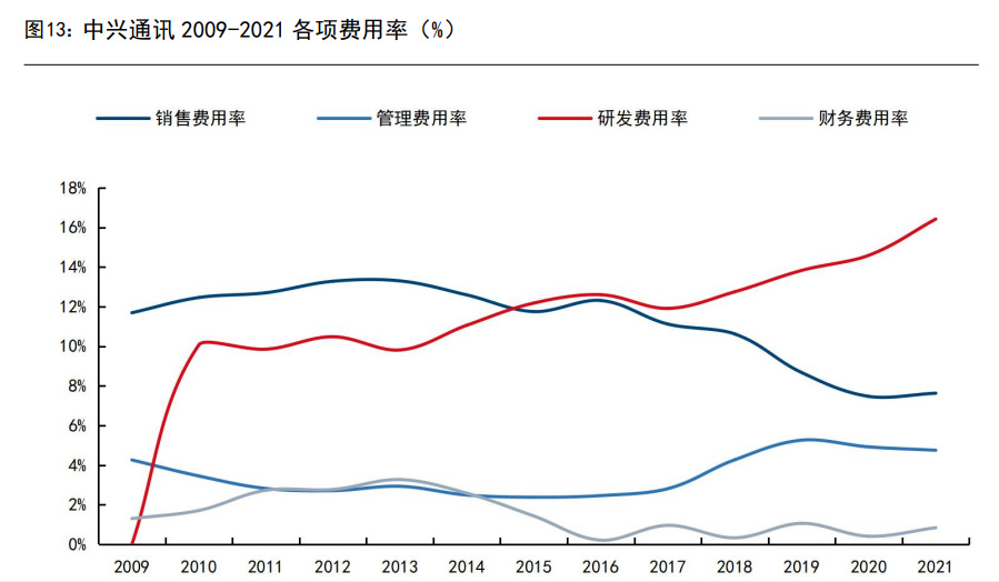 公司费用管控趋势向好。研发费用持续加大,即使经历三次亏损,研发费用率也没有较大波动,2021 年更是高达 16.42%,造就公司5G 时代技术的领先地位。销售费用率从 2013 年开始逐年下滑,2020 年销售费用率降至历史低点的7.47%。管理费用和财务费用保持稳定低位,管理费用率 2018 年开始有所上升,2019年达到高位 5.26%后又逐渐下降。