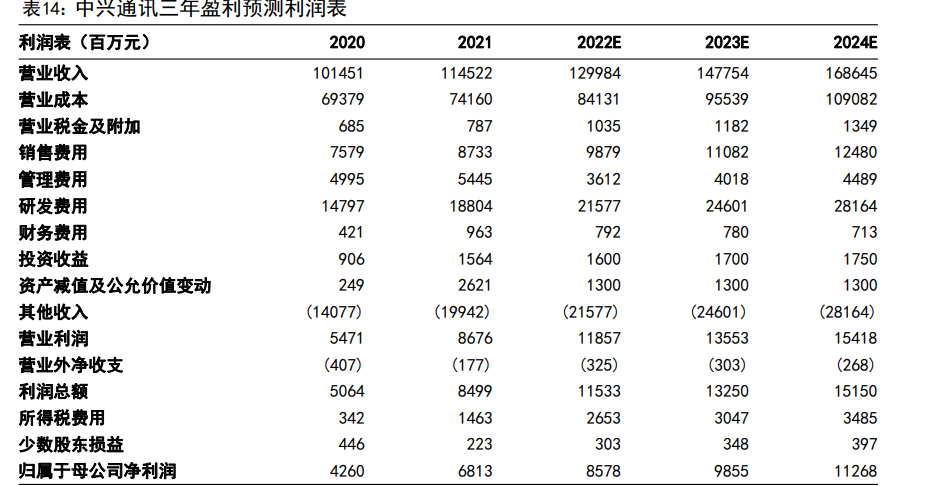 基于上文分析行业发展及公司在行业地位,对中兴通讯核心业务进行预测: