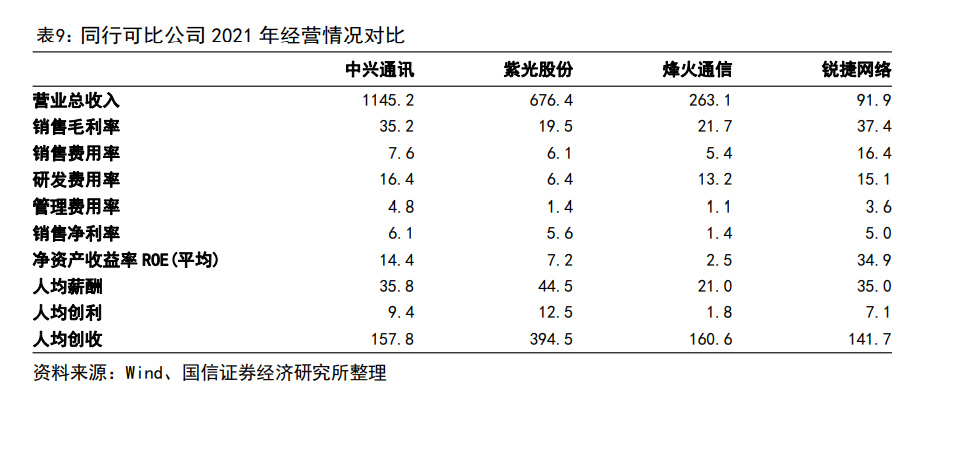 通信行业市场已被头部公司占据,上市公司通信设备商主要包括紫光股份、锐捷网络、烽火通信,公司经营规模远大于同行,研发投入领先于同行。