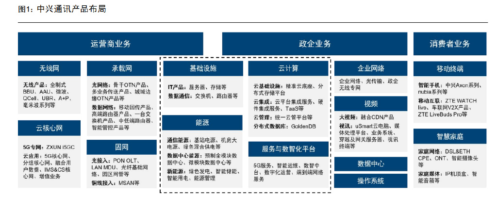 通信设备商龙头经营稳健,加速拓新第二曲线公司是全球稀缺的 5G 端到端设备解决方案提供商,通过全系列的无线、有线、云计算、终端产品和专业通信服务,灵活满足全球不同运营商和政企客户的差异化需求以及快速创新的追求。 中兴通讯的业务按客户维度可以划分为运营商网络业务、政企业务和消费者业务三块。其中,运营商板块和政企板块在业务上存在重合,如云计算、IT 产品、能源等。