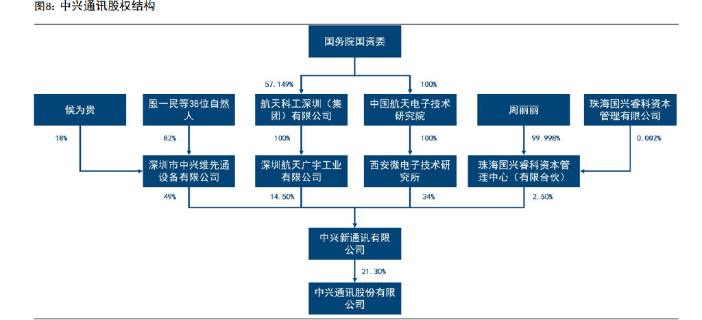 公司控股股东中兴新是由西安微电子、航天广宇、中兴维先通三方股东合资组建。2017 年 4 月,航天广宇向国兴睿科公开转让持有的中兴新2.5%股权,股权交割完成后西安微电子、航天广宇、中兴维先通及国兴睿科分别持有中兴新34%、14.5%、49%和 2.5%的股权。中兴新现有董事 9 名,其中西安微电子推荐3 名,航天广宇推荐 2 名,中兴维先通推荐 4 名,分别占中兴新董事会的33.33%、22.22%及44.45%。