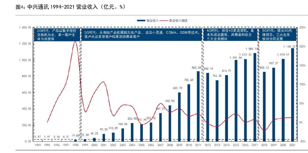 公司成立于 1985 年,在香港和深圳两地上市,业务覆盖160 多个国家和地区,服务全球 1/4 以上人口。公司传统业务稳健发展,并加速第二曲线拓新。主营产品发展经历四个阶段 :第一阶段 2G 时代(1990-1998 年):单一客户主体为运营商;1990 年公司自主研发数字程控交换机 ZX500;1998 年成立手机产品部进军手机市场。 第二阶段 3G 时代(1999-2011 年):客户从运营商客户拓展到消费者客户;1999 年推出 ZTE198 全中文双频手机和 GSM900/1800 双频移动通信系统;2003年依靠 CDMA 技术终端合同。 第三阶段 4G 时代(2012-2017 年):基本形成运营商、消费者和政企三大业务模块;2012 年推出首款单芯片 4GLTE 智能手机;2015 年实现营收突破千亿,跻身全球四大通信主设备商。 第四阶段 5G 时代(2017 年至今):运营商、消费者和政企三大业务模块协同发展;成为全方位解决方案提供商。