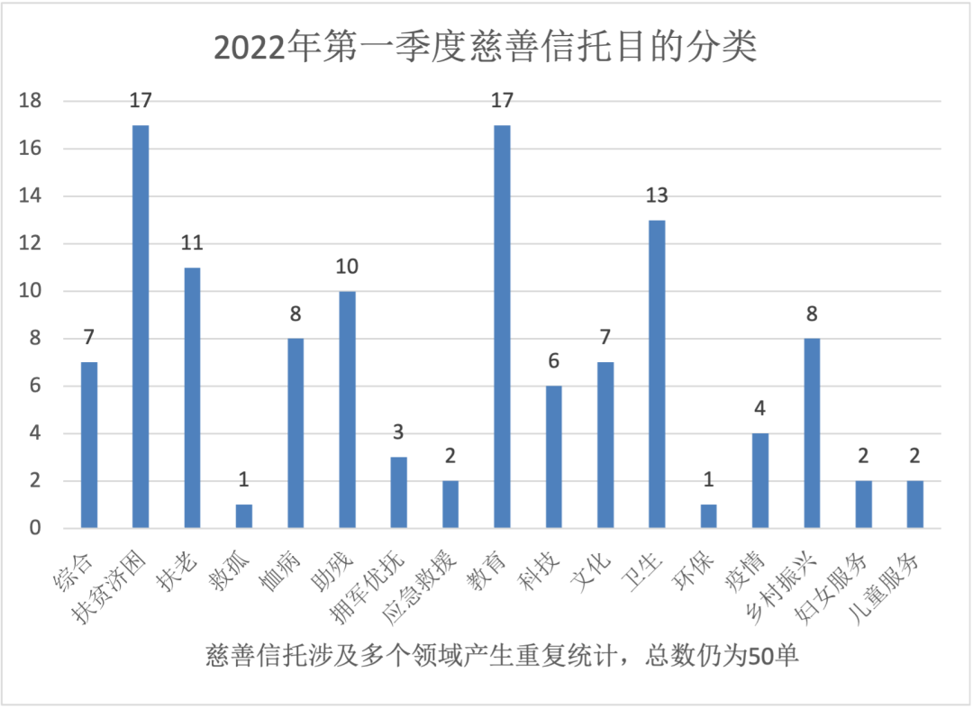 从设立目的来看,2022年第一季度备案的50单慈善信托中,涉及扶贫济困、扶老、救孤、恤病、助残、拥军优抚、科教文卫、环保、抗击疫情、乡村振兴等领域;关爱群体包括妇女、儿童,其中,以乡村振兴为慈善目的的慈善信托共八单,总规模660万元。